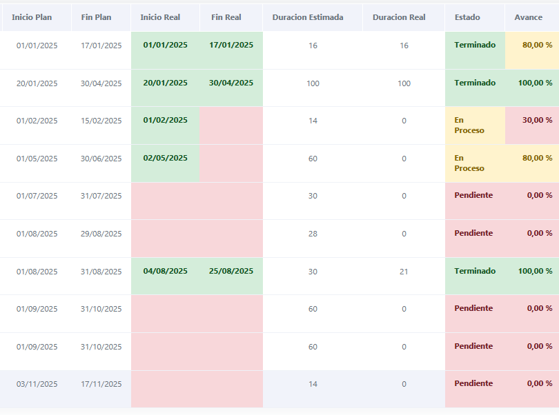 - Estados automáticos: Planificada / En Proceso / Ejecutada / Retrasada